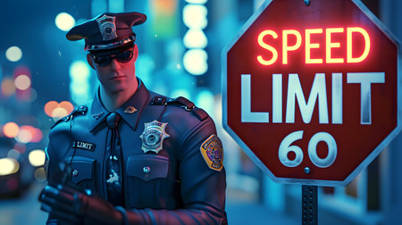 Illustration of a stern-looking police officer standing next to a speed limit sign, conveying law enforcement and traffic control themes.