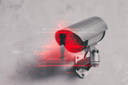 CCTV Security camera with a red warning sign overlay is mounted on a gray concrete wall, blending surveillance with a sense of alert. Concept for security and technology