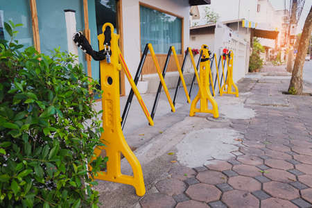 Selective focus of Barricade on the sidewalk with sunlight
