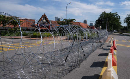 PETALING JAYA, MALAYSIA - MAY 8, 2020 : Barbed wire barriers near the wet market Jalan Othman during the 'movement control order' COVID-19 outbreak.