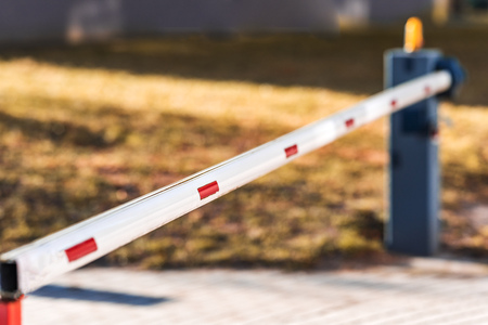 Automatic barrier white and red. The barrier is closed. The background is blurred. Shallow depth of field.