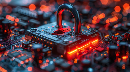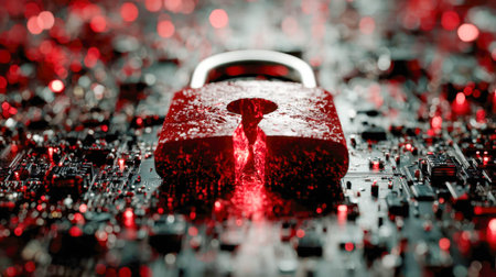 A close-up image of a red padlock securely fastened on a complex circuit board, symbolizing high-tech security and data protection. The intricate details of the circuit board and the vivid red of the padlock highlight advanced cybersecurity measures.