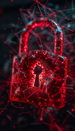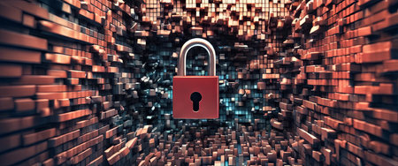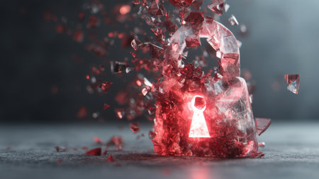 Shattered padlock with glowing red elements symbolizes security and vulnerability. fragmented pieces create dramatic visual effect, representing concept of breaking barriers and unlocking
