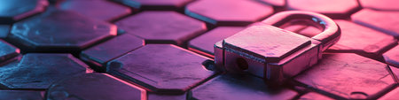 Metal padlock on the hexagonal background. Cyber security concept.