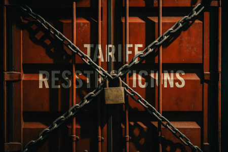 Trade barrier concept with chains and padlock on container door.