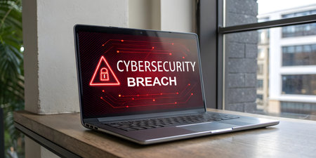 Sci-fi inspired cyberattack with holographic screen showing SECURITY BREACH in bold, glitching tex. Generative AI