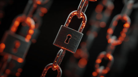 Close-up view of a strong metal chain featuring a securely locked padlock against a dark background, representing the essence of security and protection in modern technology.