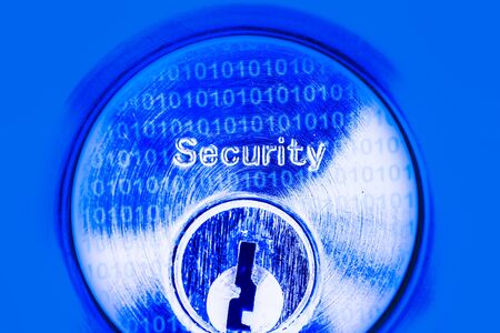 Security text on the door lock with key hole under a blue light with reflection of code. Cybersecurity concept.