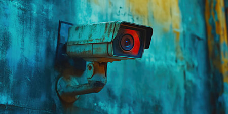 Modern Surveillance Camera on Metallic Pole against Textured Teal Background for Security Monitoring and Privacy Concept AI Generative