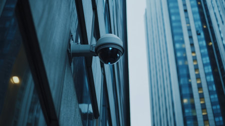 A detailed view of a surveillance camera mounted on an urban building, showcasing modern architecture and skyscrapers around. Ideal for themes of security.