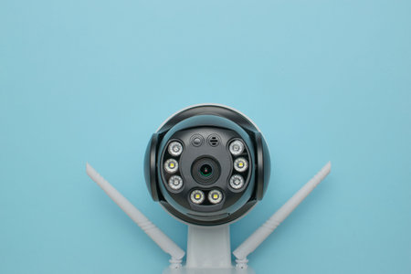 Modern Home Security Camera with Antennas on Blue Background