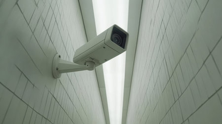A sleek surveillance camera mounted on a wall offers a modern design with a minimalistic aesthetic. Ideal for concepts of security and monitoring.