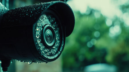 Close-up of waterproof smart security camera with raindrops on lens