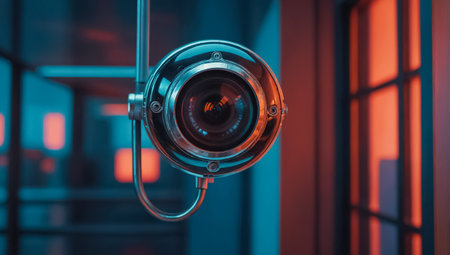 Close-up of a security camera in a dark room with red light
