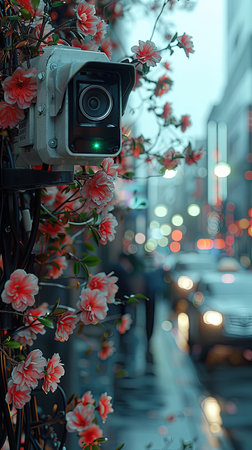 The advanced security camera is installed on a wall surrounded by blooming flowers, providing vigilant monitoring in a bustling urban environment during twilight. Lights from nearby vehicles and buildings create a vivid backdrop, enhancing the scene's dynamic atmosphere.
