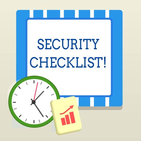 Word writing text Security Checklist. Business photo showcasing Protection of Data and System Guide on Internet Theft Layout Wall Clock Notepad with Escalating Bar Graph and Arrow Pointing Up