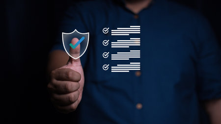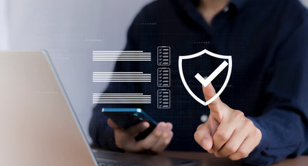 Businessman using smartphone and laptop with security shield icon on screen.