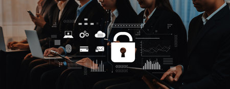 A group of business professionals focuses on cybersecurity during a conference, highlighting the importance of data protection with digital security icons and visuals.