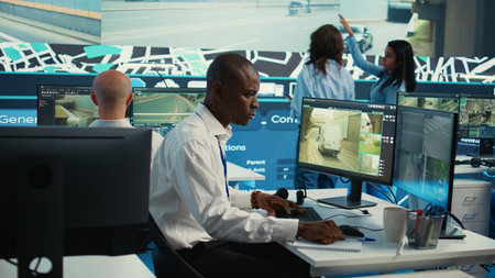 African american call center dispatcher sends gps coordinates of new routes to couriers in the field, helping to deliver orders in time. Employee works on express shipping service, CCTV footage.