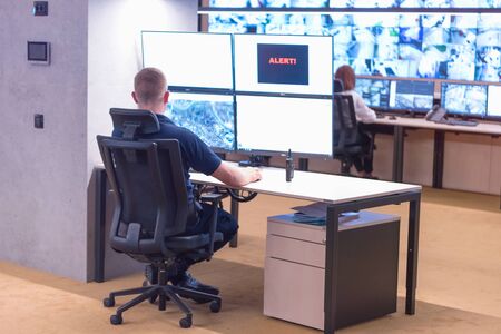 Group of security operators working in a data system control room Technical Operators Working at workstation with multiple displays, security guards working on multiple monitors in surveillan