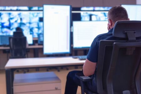 In the Security Control Room Officer Monitors Multiple Screens while receiving the alert signal.
