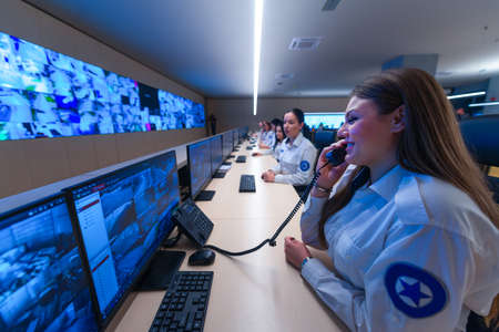 Group of Security data center operators working in a CCTV monitoring room looking on multiple monitors.Officers Monitoring Multiple Screens for Suspicious Activities