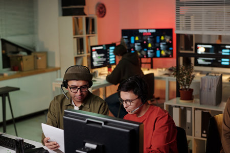 Two young adult men wearing headsets sitting at desk discussing script while working on computer in scam call center, background showing monitors
