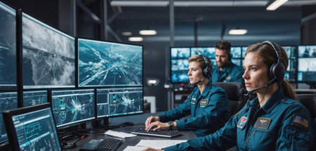 team of professional operators working together in a control center, using multiple screens to monitor data and coordinate, showcasing a high-tech, collaborative, and focused work environment.
