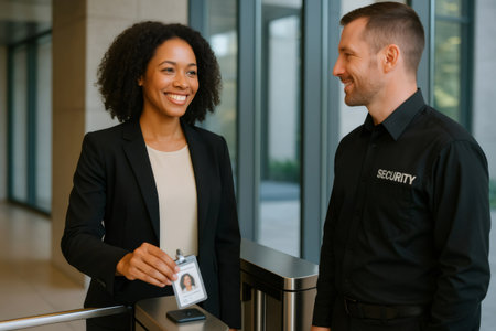 Professional woman smiling, showing identity card to a happy security guard at an access control turnstile in a corporate lobby