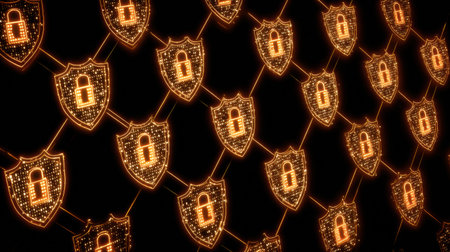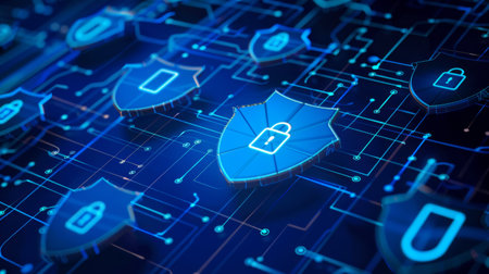 Glowing shield patterns with digital locks illustrate advanced network security for secure data transmission lines.