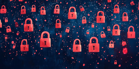 Digital illustration of red locks in various sizes floating against a dark blue background. Perfect for themes related to cybersecurity, data protection, privacy, or secure communication.
