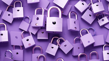 Many padlocks on a purple background. 3D rendering illustration.