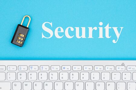Security message with gray keyboard with a combination lock on a blue paper