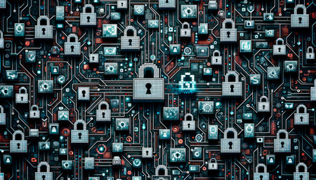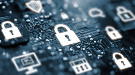 Abstract Digital Background of Cyber Security Theme with Lock Icons and Circuit Patterns Representing Online Protection and Data Security Concepts