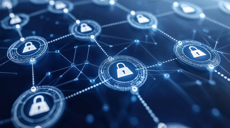 Secure Digital Network with Blue Shield Icons Representing Cybersecurity and Data Protection