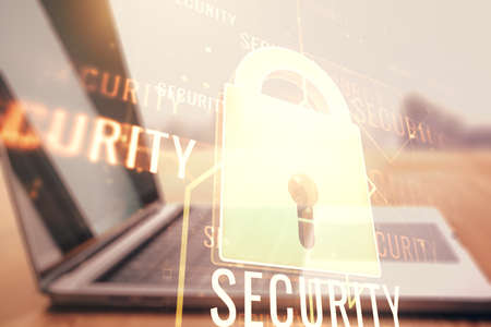 Double exposure of lock drawing over desktop. Top view. Security concept.