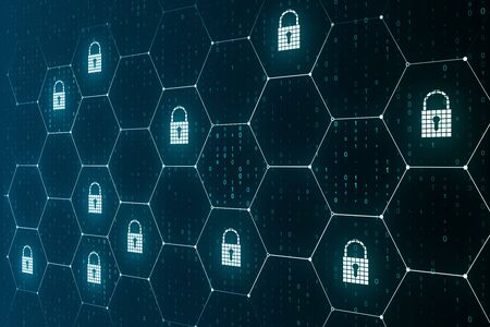 Cyber security concept with padlock and hexagon on blue background