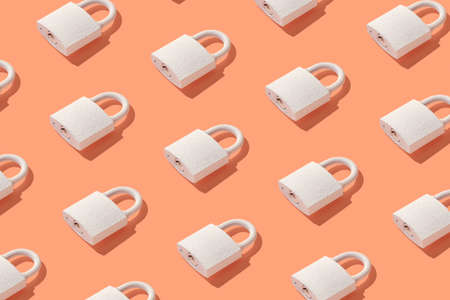 Pattern from padlock on trendy coral background. Minimal concept of protection and security.