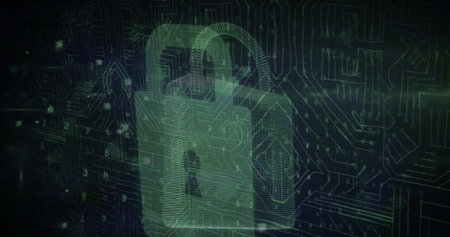 Image of data processing over security padlock icon against microprocessor connections. Cyber security and business networking technology concept
