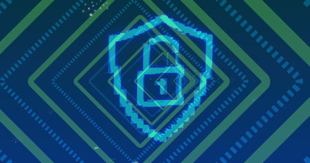 This artwork features a padlock symbol amidst colorful geometric shapes, representing digital security and protection in a modern, tech-driven world.