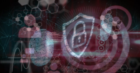 Image of digital shield with padlock, fingerprint and chemical formulas on red background. Data safety, digital security, global network and technology concept digitally generated image.