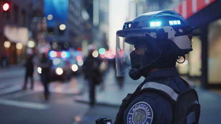 A police officer equipped with advanced protective gear and a high-tech helmet stands vigilant on the busy city streets at twilight, ensuring public safety.