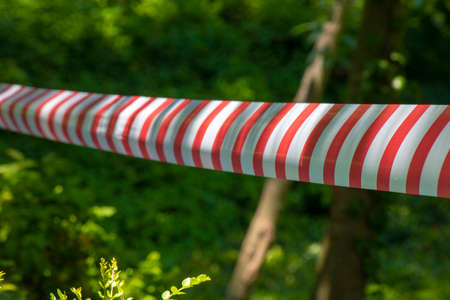 ban ribbon red and white color fenced zone of park walking area concept advertising photography pandemic or construction working theme with sun light and glare background scenic view