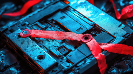 A captivating close-up of a retro cassette tape featuring vibrant neon colors and a torn ribbon, set against a shiny, crumpled foil background, creating an abstract artistic representation.