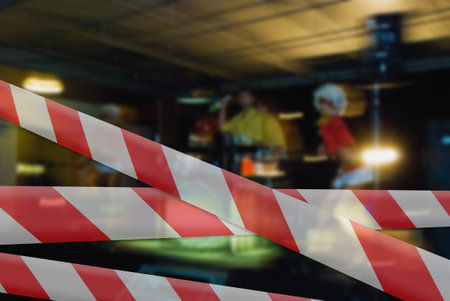 Close up of red and white police tape. Avoid crossing any caution signs. specially blurred picture