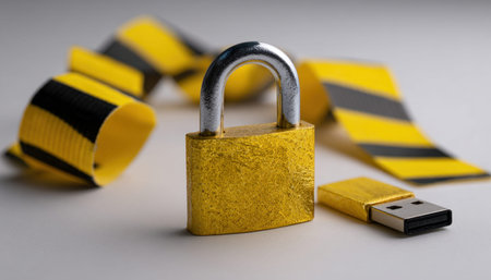 A yellow padlock and USB drive are arranged on a tabletop, surrounded by striped caution tape, creating a visually striking still life composition with ample copy space for design purposes