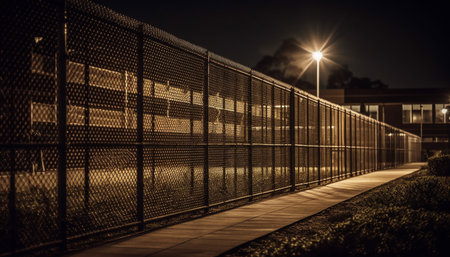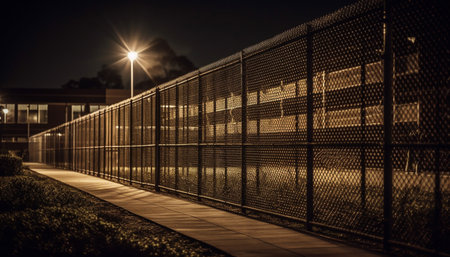 Vanishing point of modern architecture, empty prison illuminated at dusk generated by artificial intelligence