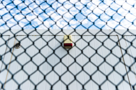 Barbed iron wire against blue sky. Industrial zone protected with a lattice fence. Warehouse, factory territory. Private property. Jail, prison zone.