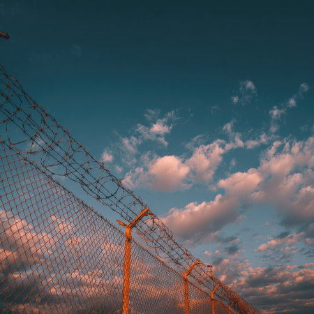 A tall fence topped with barbed wire and surveillance cameras conveys a strong sense of protection and restricted access against a cloudy backdrop.
