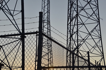 telecommunication and radio relay antenna radio towers are silhouetted in the morning sky.